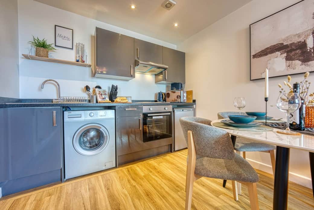 Kaffeemaschine, Küchenausstattung, Küchenherd, Kochnische, Mikrowelle, Backofen, Kühlschrank, Toaster
